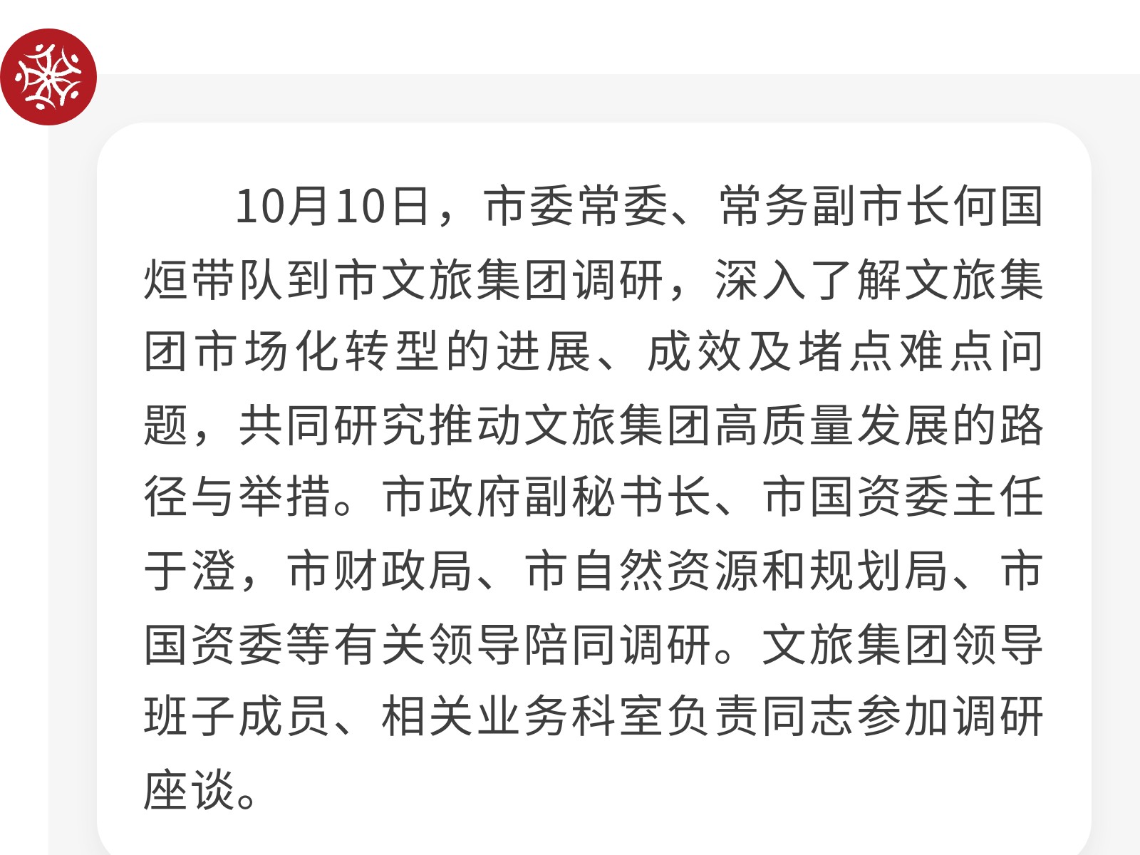 市委常委、常務(wù)副市長何國烜到市文旅集團(tuán)調(diào)研 發(fā)布時間:2025年10月11日 15時來源:本站原創(chuàng)瀏覽:58 人次
